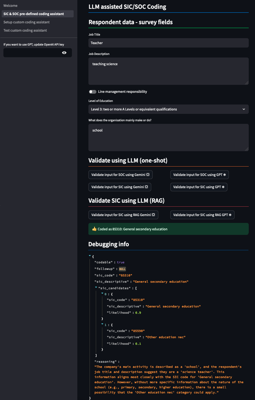 A proof-of-concept large language model (LLM) application was created to assess whether an LLM could improve SIC autocoding performance for survey data. This was applied to sample of anonimized survey data and evaluated by comparing the results to clerical coding and to logistic regression model. The LLM showed marginal improvement over the logistic regression in the level of agreement with clerical coding at the 5-digit SIC level. It is likely that refinement of the method would improve performance further. Note that the evaluation scripts are out of scope for this repository. The methodology of the main SIC autocoding module is described bellow. For more information see Data science campus blog.